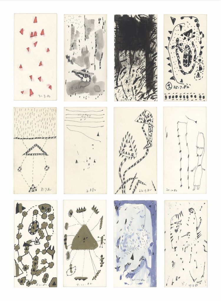 Among these countless drawings, three batches are particularly captivating. Firstly: cards, primarily created between 1982 and 1986, with intermittent additions until 1989, numbering no fewer than 3,000 pieces (Figure 1); second: over thirty pencil sketches from 1989; and, third: collages using printed ephemerals, created since 1996, numbering approximately 240 to date.