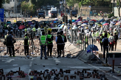 Journalists behind the protest frontline during protests outside The Hong Kong Polytechnic University, 2019 (photo: John Batten)