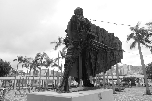 The following day, Hong Kong experienced strong winds and heavy rain, the peripheral influence of a near-typhoon off Hainan Island. I had gone to Tsim Sha Tsui to photograph the now closed Swindon bookshop and to buy a bottle of wine for a late night of card-playing (Canasta, not the more hard-nosed poker!). As I walked to the ‘Star’ Ferry, I was tossed around by the wind and lashings of rain. On the waterfront, César’s The Flying Frenchman, originally titled ''Freedom Fighter'' a title rejected by the Hong Kong authorities in 1992, was tethered and restrained because of the ''strong wind signal.’ As a metaphor for Hong Kong after the previous day’s cancellation of the Legislative Council elections it is awfully perfect: I suggest we keep the ropes and restraints permanently tethered to the sculpture as a reminder; and only untethered when we can again have free and fair elections.