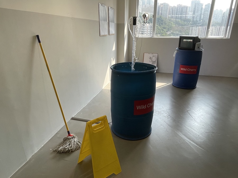 緊接的《靜物寫生》鏡櫃,陳列了羈留人士可使用的物品,程氏將它們畫成牆上的素描。從牙膏、潤膚露、紙巾到朱古力和香煙,似乎應有盡有的日常用品,不少也是大眾常用的東西,以為可以選擇,其實已是全部。九部電視機組成了《越境犯罪》,影片以不同國家的「特別罪行」為題,例如法國不准在火車月台接吻、泰國不准不穿內褲、新加坡不准食香口膠,程氏在香港逐一演示,自嘲著「我們還有些自由」。這兩組作品不禁令人反思,在經歷過反送中和疫情的兩年不尋常歲月後,日子是怎樣過的呢?似是正常,卻又明知不是,諷刺意味十足。
