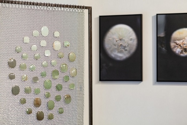 Leelee Chan “Celadon Weaver”, 2020, Ceramic shards (Qingbai ware, Longquan ware and Yaozhou ware) from Song to Ming dynasties (10th to 17th centuries AD), 925 silver, stainless steel chain mail and steel stand; Leelee Chan “Surface Morphology”, 2020, Archival pigment prints, Gallery 149. Photo courtesy of the organiser.